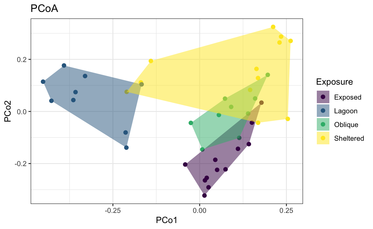 We now want to examine how the four regimes of wave action impact reef fish community composition across all families. With more than 200 fish species across all families, this is a tough ask for PCA so we will move to distance based ordinations.