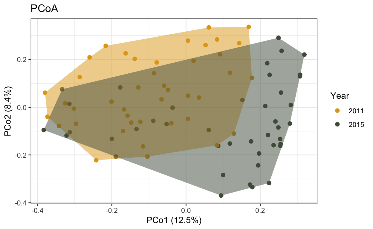geom_polygon(data = lizard.hulls.b, aes(x = Axis.1, Axis.2, fill = as.factor(year)), alpha = 0.5) +
